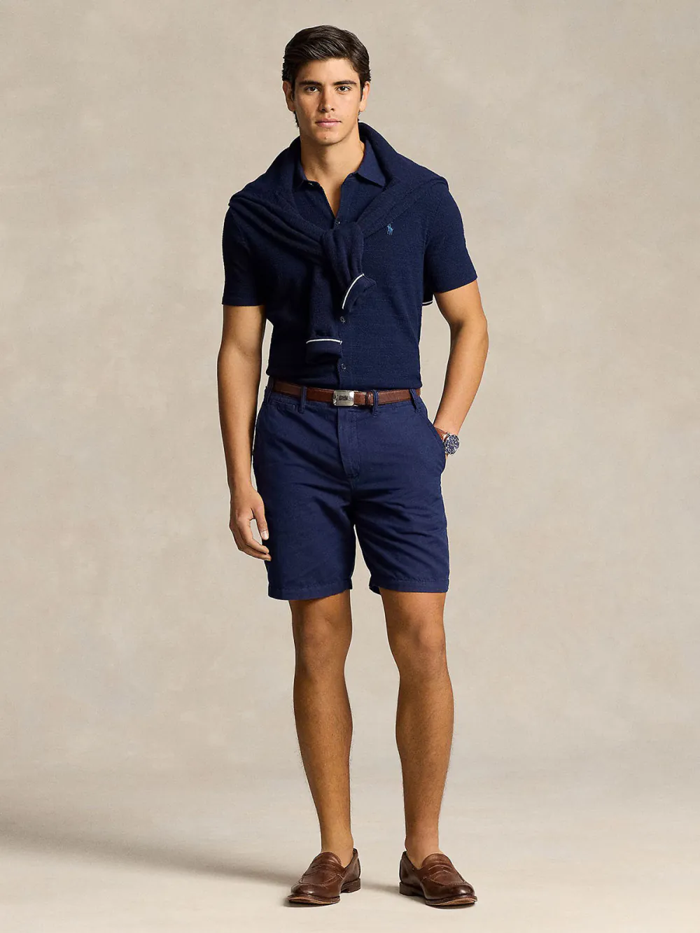 Với quần short kaki, hãy chọn polo dáng slim và sơ vin nhẹ. Diện thêm đồng hồ thể thao, sneakers vải và kính râm là bạn đã có ngay set đồ chuẩn cho buổi dạo phố hoặc đi cà phê cuối tuần.