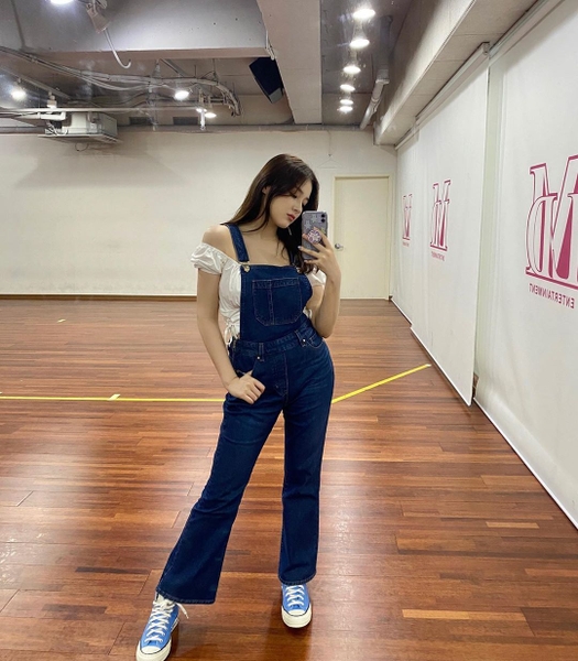 Kết hợp áo trễ vai bên trong quần yếm jeans mang lại sự trẻ trung, đáng yêu. Thêm đôi sneaker trắng và balo mini, bạn sẽ có ngay outfit năng động để dạo phố hoặc đi chơi cùng bạn bè.