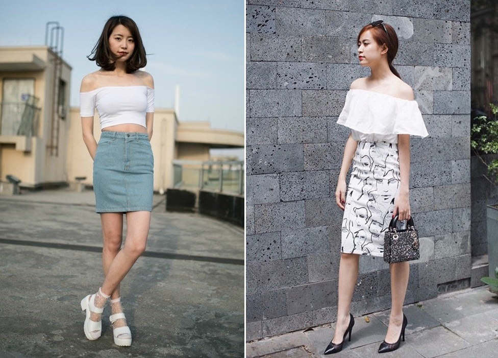 Chân váy chữ A kết hợp cùng áo trễ vai sẽ mang lại vẻ đẹp vừa ngọt ngào vừa tươi trẻ. Váy dáng ngắn giúp đôi chân trông dài hơn, còn nếu bạn chọn váy dài ngang gối, outfit sẽ trở nên nền nã hơn.