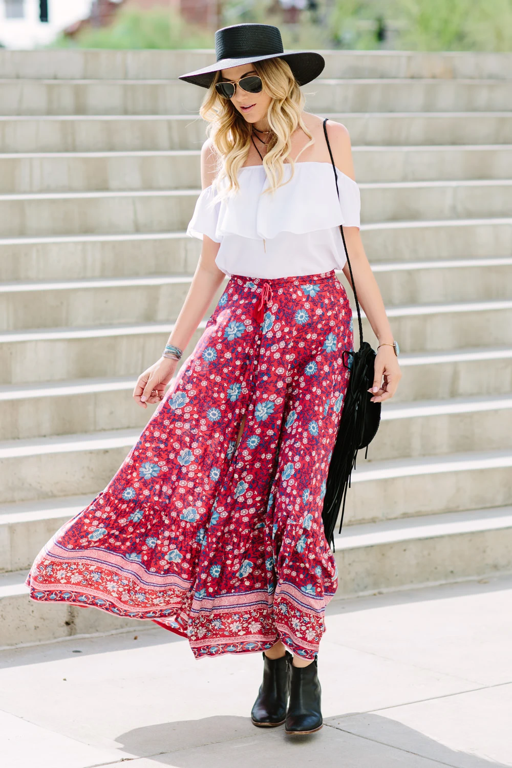 Nếu muốn diện áo trễ vai theo phong cách thanh lịch, quần ống rộng là “người bạn đồng hành” lý tưởng. Chọn quần có chất liệu rủ nhẹ như lụa hoặc chiffon để tạo sự mềm mại khi di chuyển.