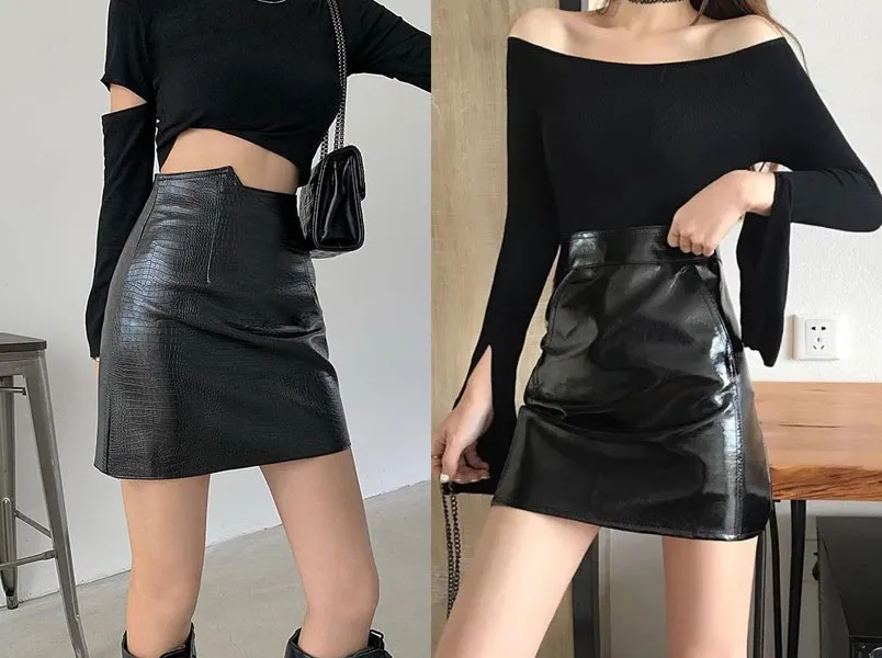 Chân váy da mang sắc thái mạnh mẽ, trong khi áo trễ vai lại mềm mại và nữ tính. Sự kết hợp tương phản này sẽ tạo nên một outfit ấn tượng, và nếu thêm boots cổ ngắn hoặc cao gót mũi nhọn, vẻ cá tính sẽ được nhân đôi.
