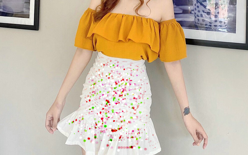 Váy đuôi cá ôm sát phần hông rồi loe nhẹ ở gấu giúp tôn dáng tối đa, và khi đi cùng áo trễ vai, hiệu ứng này càng rõ rệt. Hoàn thiện diện mạo bằng giày cao gót mũi nhọn và khuyên tai dài để tăng thêm nét quyến rũ.