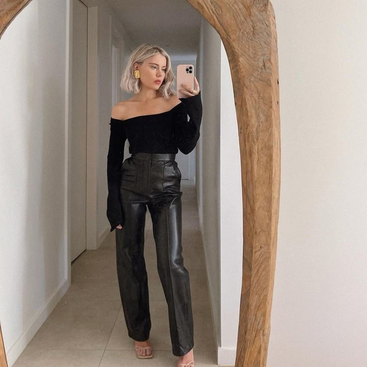 Một sự phá cách đầy cá tính là kết hợp áo trễ vai nữ tính với quần da cá tính. Sự đối lập về chất liệu tạo nên outfit nổi bật, thích hợp cho những buổi đi chơi tối. Chỉ cần thêm đôi boots cao gót và clutch, bạn sẽ trông cực kỳ thời thượng.