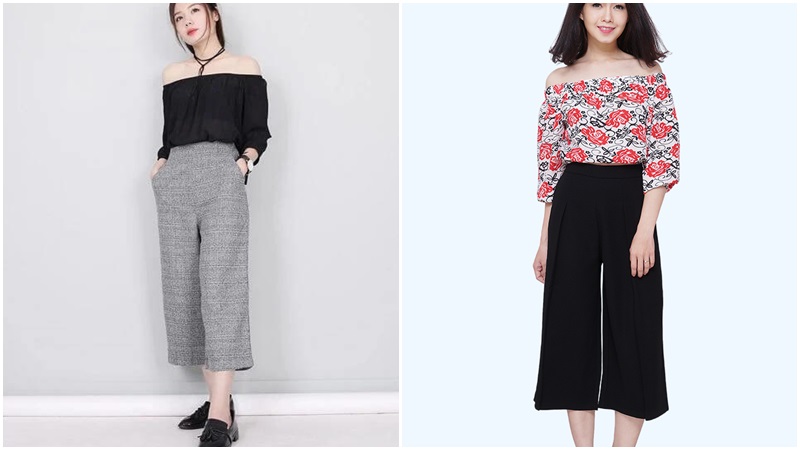 Quần culottes thoải mái nhưng không kém phần thanh lịch, khi đi cùng áo trễ vai sẽ mang đến vẻ ngoài phóng khoáng. Giày loafer hoặc sandal quai mảnh sẽ giữ cho outfit nhẹ nhàng, dễ chịu.