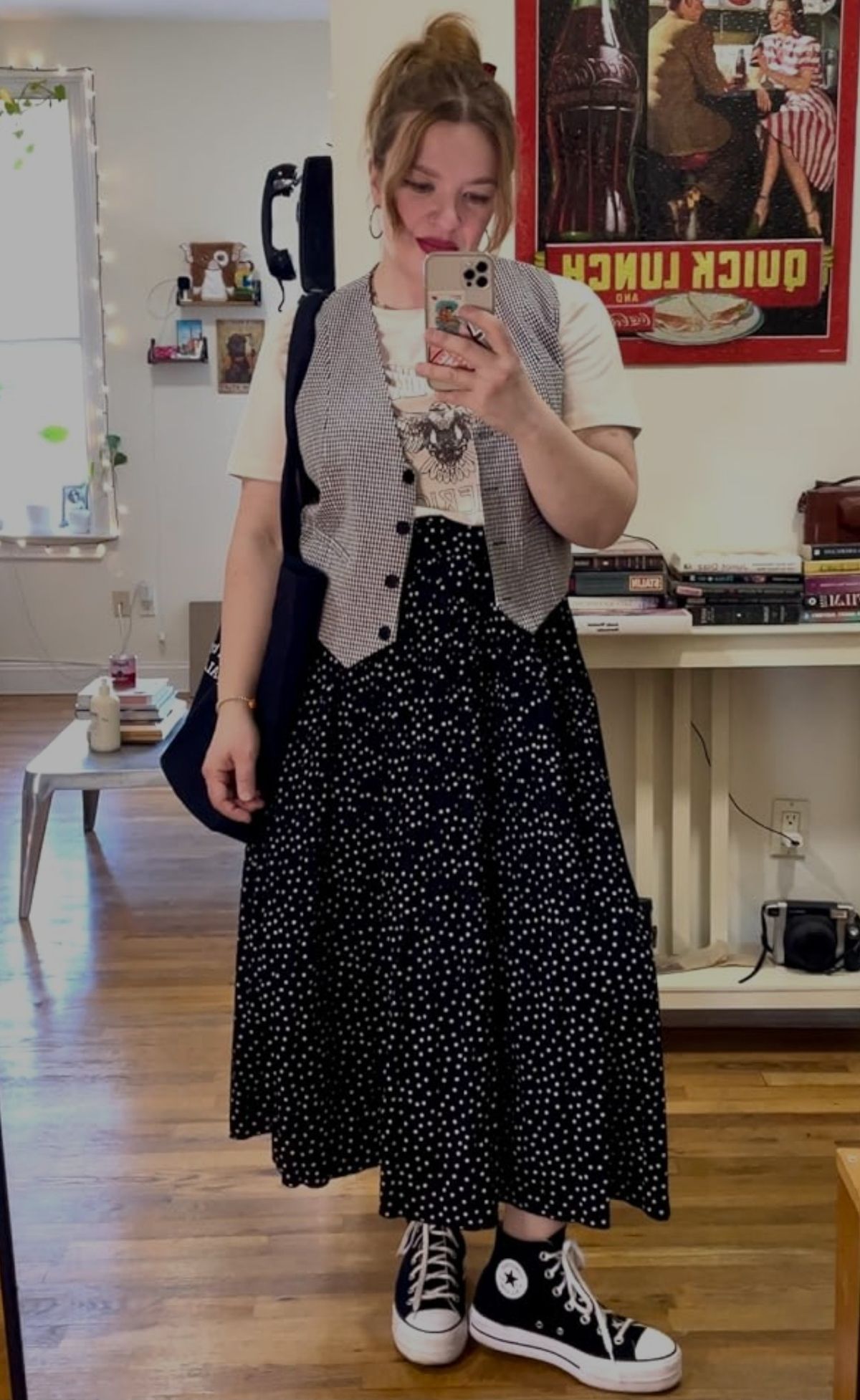 Áo gilekết hợp chân váy dài xuông mang đến vẻ ngoài sành điệu, phù hợp cho các buổi dạo phố.
