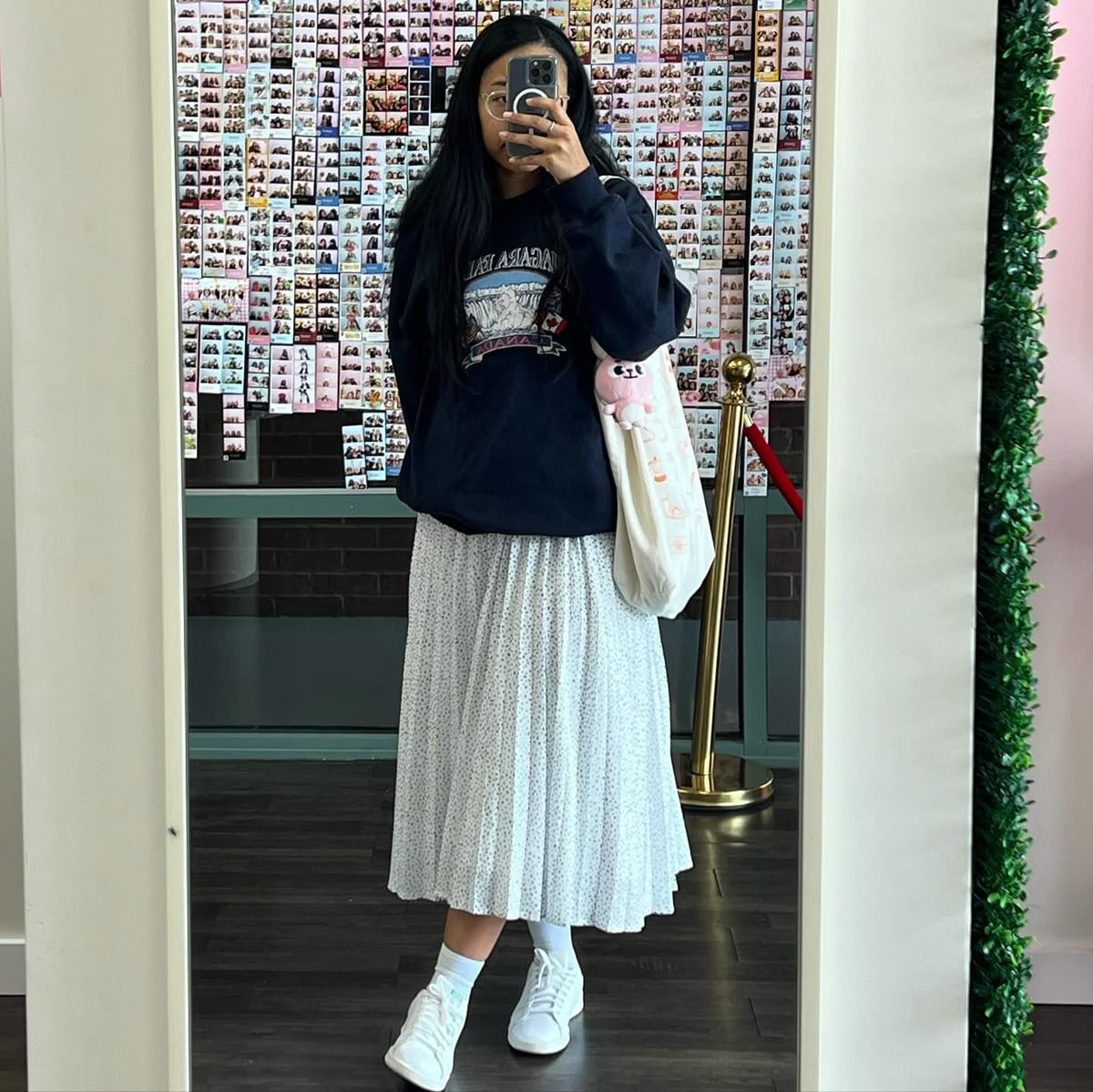 Áo hoodie phối với chân váy dài dáng suông tạo sự tương phản thú vị, vừa thoải mái vừa thời thượng.