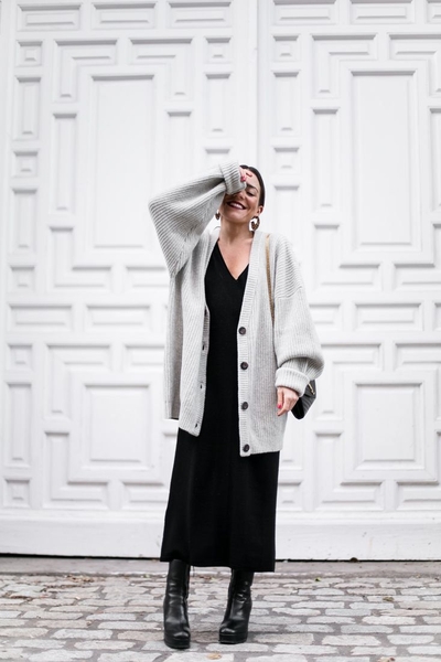 Áo cardigan tông màu trung tính (be, nâu, xanh rêu) phối với chân váy dài họa tiết hoa nhí tạo phong cách retro, dịu dàng.