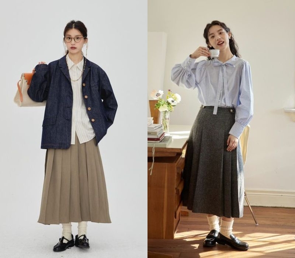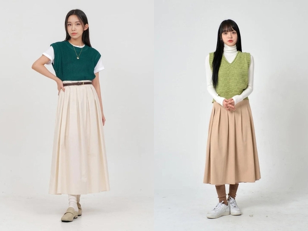 Phối áo sơ mi trắng bên trong + gile len cổ chữ V bên ngoài cùng chân váy xòe dài là công thức chuẩn style nữ sinh Hàn Quốc. Chọn gile màu beige, nâu hạt dẻ hoặc navy, chân váy có thể là chất kaki, dạ, hoặc cotton dày.