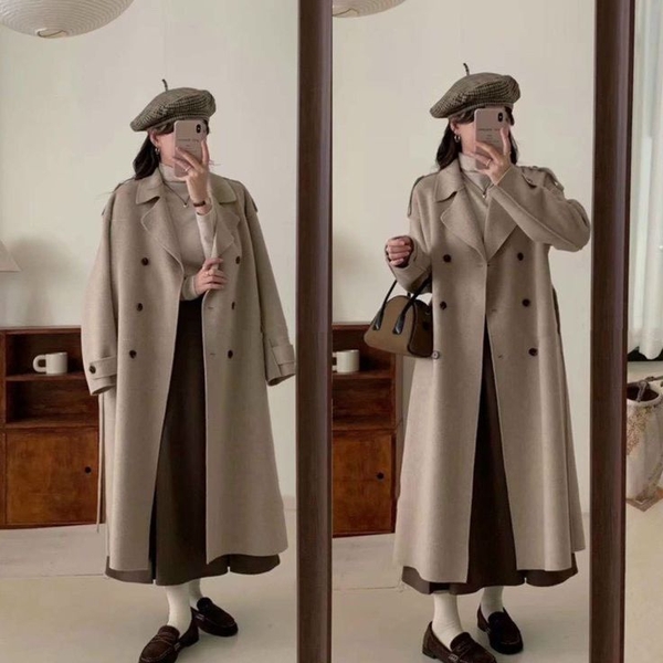 Áo măng tô dáng suông, cổ vest, chất dạ cao cấp là món đồ lý tưởng để phối với váy xòe. Bạn nên chọn tone trầm (xám khói, xanh navy) và váy sáng hơn để tạo tương phản vừa đủ.