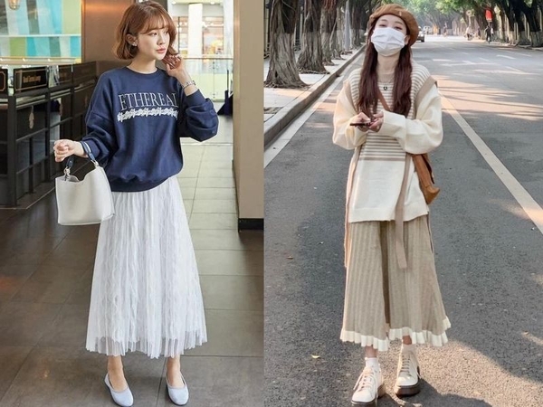 Sweater cổ tròn chất len bông dày hoặc dệt gân phối với váy xòe dài luôn là công thức an toàn nhưng vẫn rất hiệu quả. Bạn nên sơ vin nhẹ phần trước hoặc dùng dây lưng bản nhỏ để tạo form dáng chuẩn.