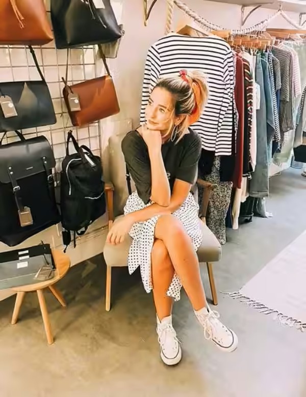 Sự kết hợp giữa váy các loại (váy suông, baby doll hoặc váy body ôm sát) cùng Converse cổ thấp tạo nên outfit vừa ngọt ngào vừa cá tính. Bạn có thể thêm vào ví da hoặc túi tote để tạo điểm nhấn sang trọng, giúp tổng thể thêm phần hài hòa.