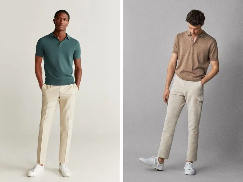 Phối giày sneaker da hoặc vải tối giản với quần tây slim-fit và áo polo mang đến sự thanh lịch, phù hợp khi đến văn phòng hoặc hẹn hò. Outfit này giúp bạn giữ được vẻ chỉn chu nhưng vẫn có chút casual. Bạn có thể thêm túi xách tay da thật và đồng hồ dây da để outfit thêm phần lịch lãm và cuốn hút.