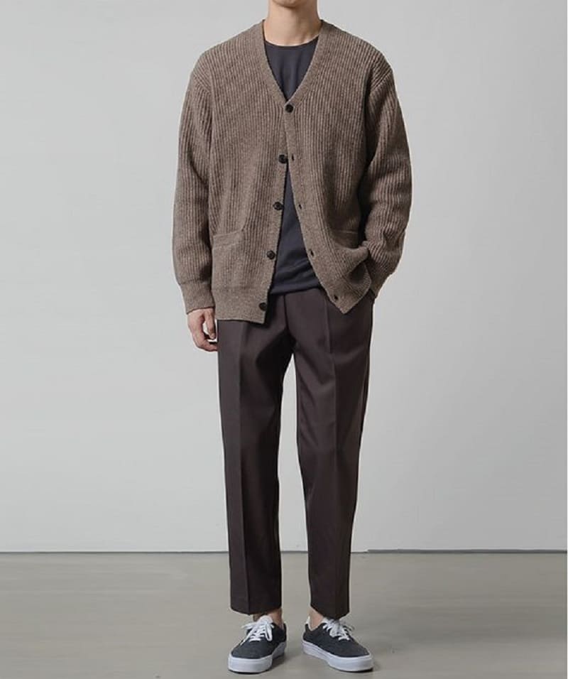 Một sự kết hợp độc đáo giữa trang trọng và casual. Cardigan mang lại vẻ tinh tế, sneaker tối giản giữ outfit không quá nghiêm túc.