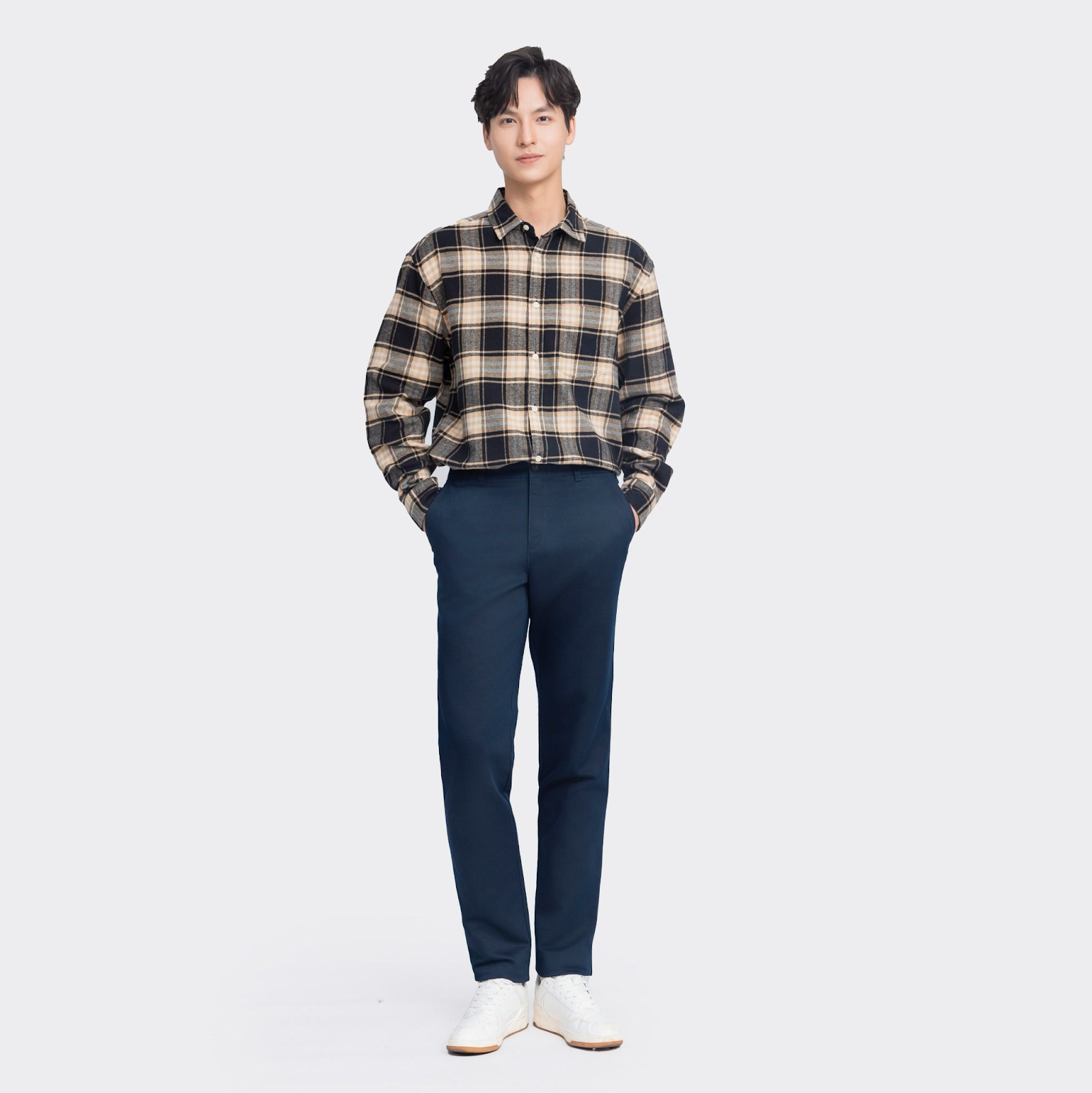 Phù hợp cho những buổi dạo phố cuối tuần. Quần chinos giúp outfit thanh thoát, sơ mi kẻ mang đến sự trẻ trung, sneaker slip-on tạo cảm giác tiện lợi và thoải mái.