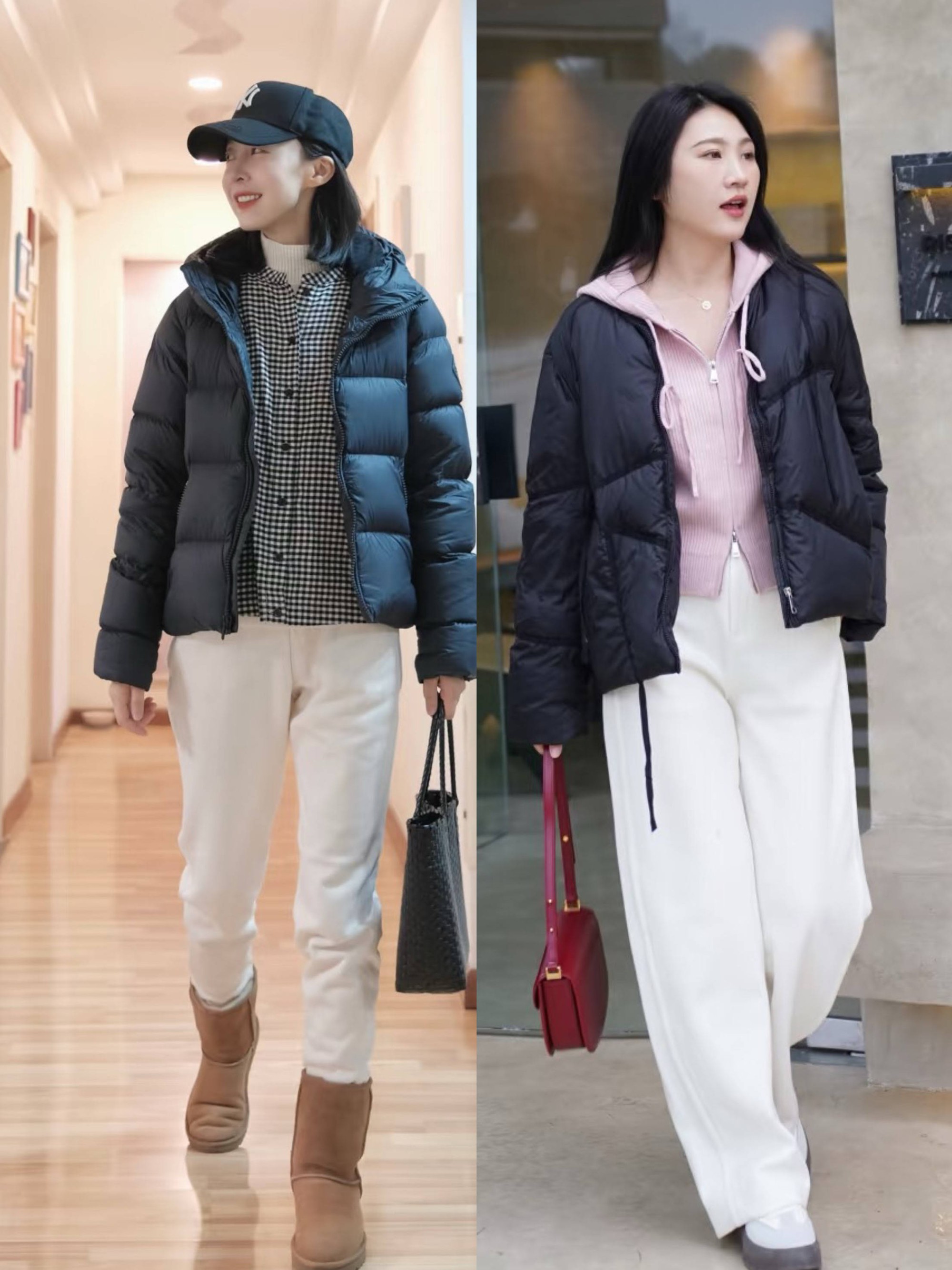 Outfit đậm chất thực dụng nhưng vẫn thời trang, thích hợp cho những ngày đại hàn. Áo phao ngắn phối cùng quần dạ hoặc quần kaki ống rộng tạo nên cảm giác ấm áp mà không bị gò bó.