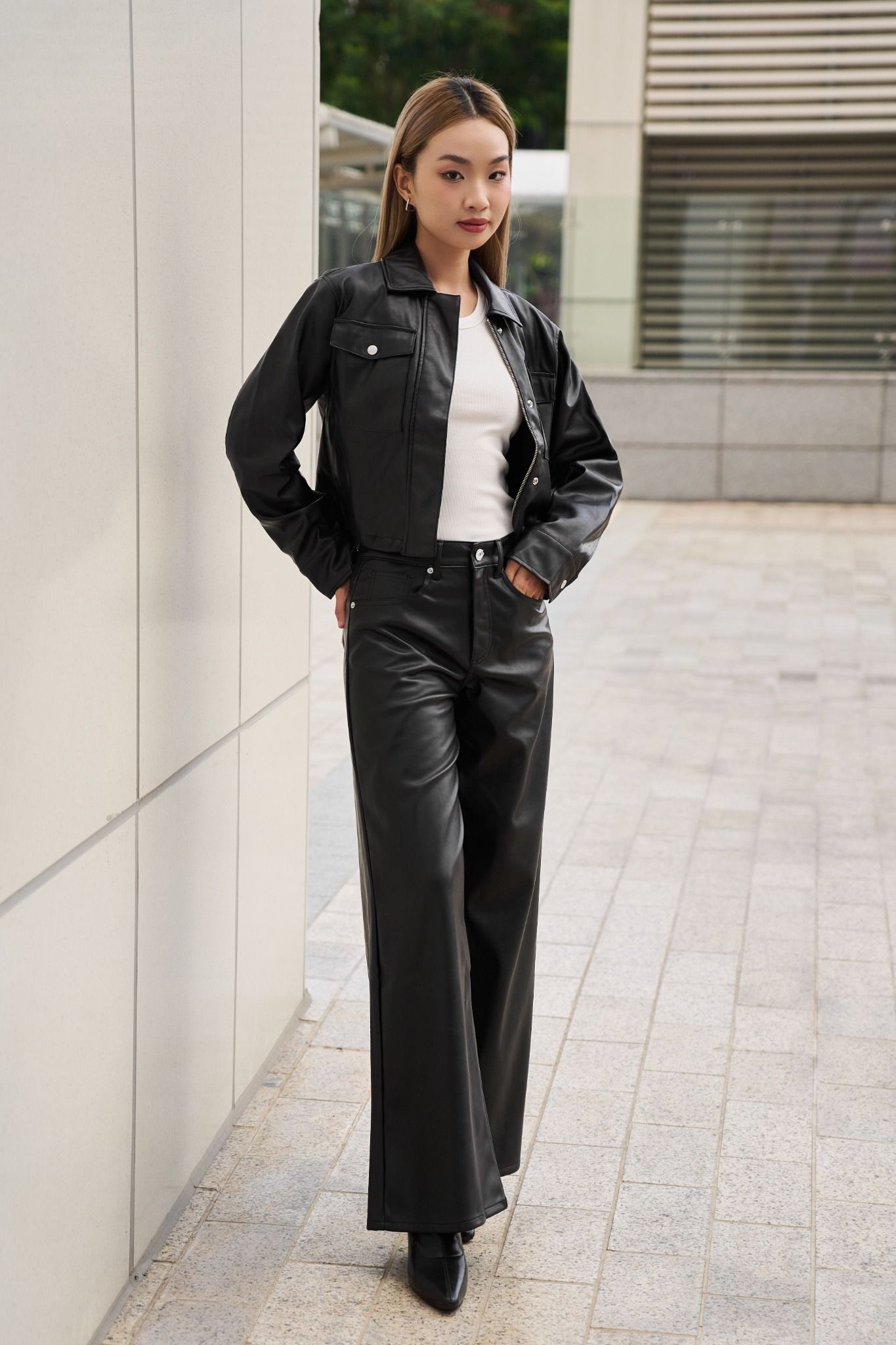 - 12. Quần ống rộng + Áo da