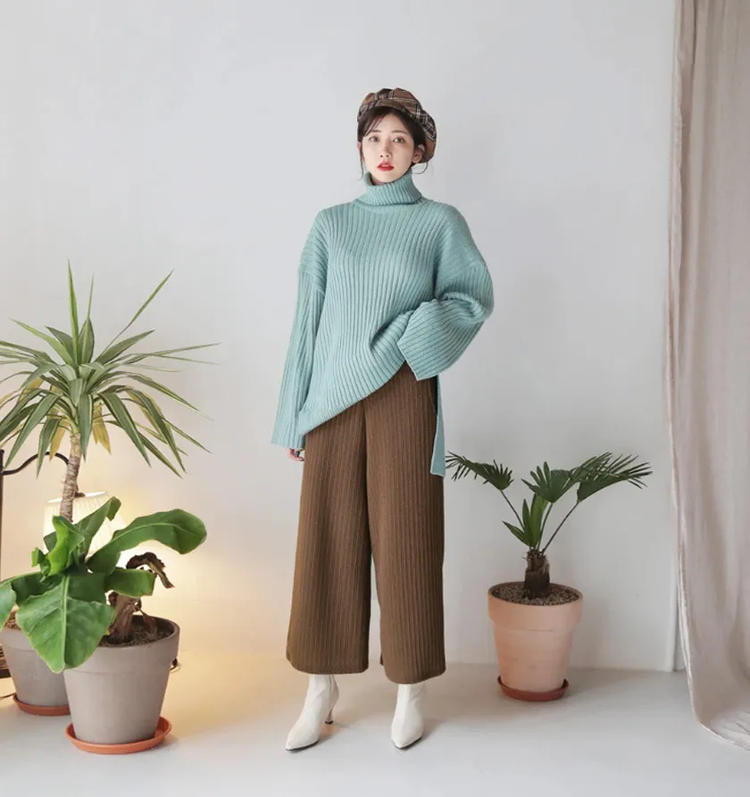 3. Quần ống rộng + Áo len cổ cao