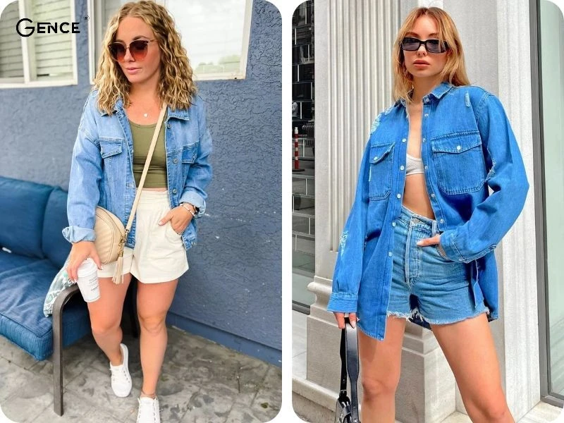 Quần short jeans hoặc kaki phối cùng áo khoác denim xanh nhạt, thêm áo thun mỏng bên trong là đủ để xuống phố trong phong cách năng động, hiện đại. Bạn có thể chọn ví cầm tay da để tăng phần sang trọng cho tổng thể denim-on-denim.