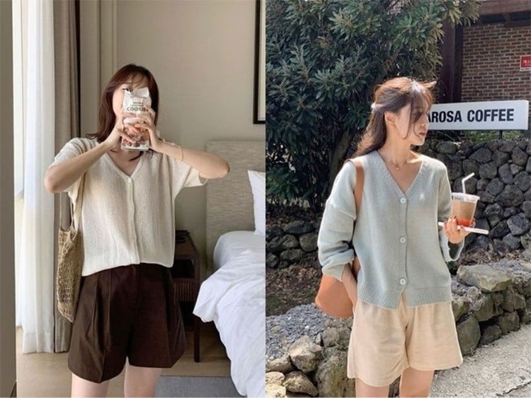 Nếu bạn yêu phong cách dịu dàng, cardigan phối cùng quần short chính là “combo chân ái”. Dáng áo cardigan mỏng, dệt kim tinh tế, phối với short dạ hoặc short vải mềm sẽ mang lại vẻ ngoài nữ tính, nhẹ nhàng. Outfit này cực kỳ phù hợp cho những buổi cà phê cùng bạn bè hoặc các buổi hẹn đầu đông.