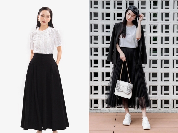 Chân váy xếp ly dài màu đen là item cổ điển, dễ phối đồ nhất. Bạn có thể phối đồ với chân váy xếp ly dài màu đen cùng áo sơ mi trắng để tạo vẻ ngoài công sở chuyên nghiệp, thanh lịch.