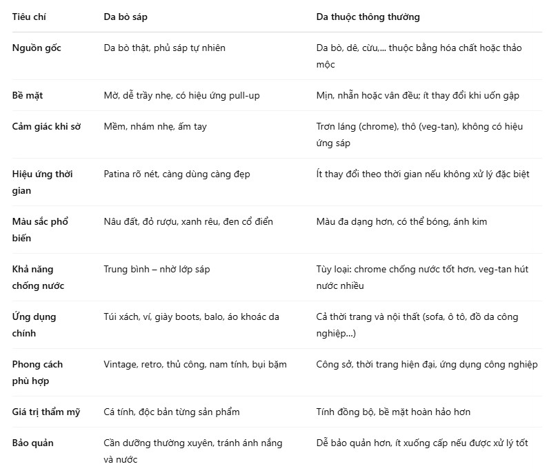 Bảng so sánh da bò sáp và da thuộc thông thường
