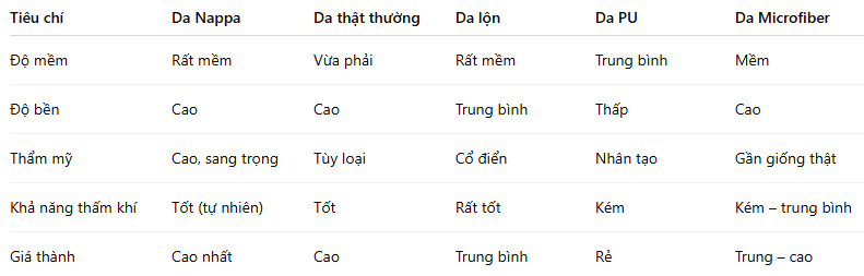 Da Nappa nổi bật nhờ sự mềm mại, sang trọng và độ bền vượt trội, khác biệt rõ so với các loại da tự nhiên thông thường và da nhân tạo. Đây là lựa chọn lý tưởng cho những ai ưu tiên cảm giác cao cấp và trải nghiệm sử dụng lâu dài.