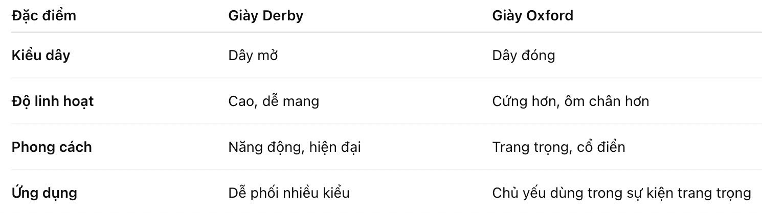 A: Khác biệt chính nằm ở thiết kế dây giày: Derby có dây mở, dễ điều chỉnh và phù hợp với nhiều kiểu chân; còn Oxford có dây đóng kín, ôm sát hơn và mang phong cách trang trọng hơn.