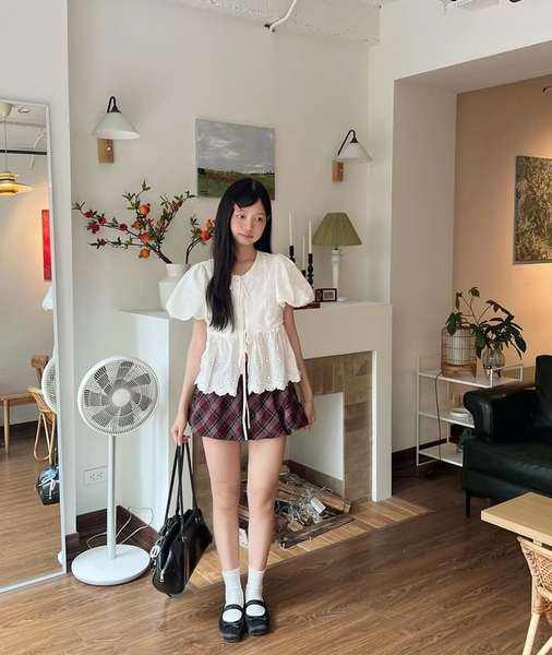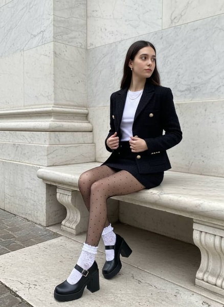 Mary Jane kết hợp cùng tất cao cổ và chân váy xếp ly tạo nên hình ảnh trẻ trung. Outfit này mang đậm tinh thần học đường nhưng vẫn rất thời thượng. Áo sơ mi trắng là lựa chọn hoàn hảo để hoàn thiện tổng thể. Sự kết hợp đơn giản nhưng tạo nên nét cuốn hút riêng biệt.