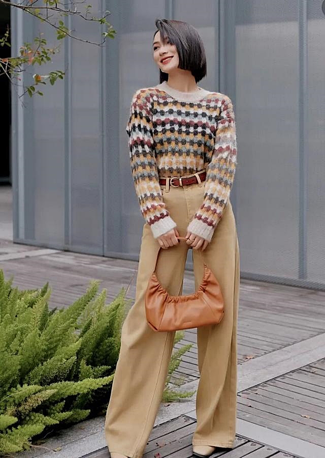 Trong những ngày se lạnh, phối quần kaki cùng áo len sẽ mang lại cảm giác ấm áp, mềm mại nhưng không kém phần thanh lịch.