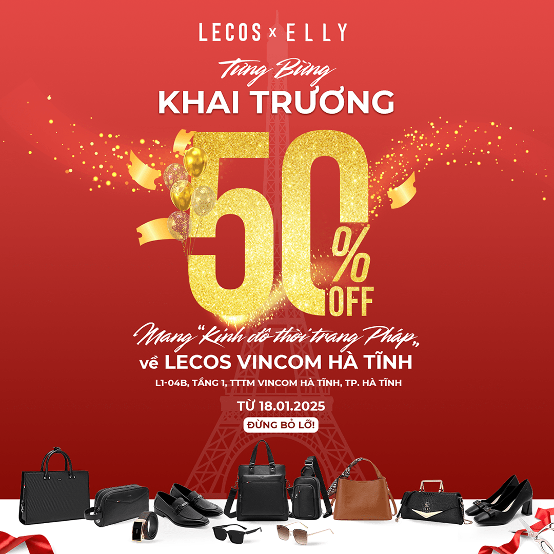 Cùng sứ mệnh đem đến phong cách phụ kiện thượng lưu mang đậm dấu ấn của kinh đô thời trang Pháp phủ rộng toàn quốc, Showroom LECOS & ELLY – 02 thương hiệu phụ kiện thời trang Nam/ Nữ hàng đầu Việt Nam nổi bật với nét thanh lịch trong kiểu dáng & đẳng cấp với chất liệu da thật từ Italia, chính thức khai trương cùng khuyến mãi khủng GIẢM 50% TOÀN BỘ SẢN PHẨM tại địa chỉ L1-04B Tầng 1 TTTM VINCOM Hà Tĩnh - P. Hà Huy Tập - TP. Hà Tĩnh.
