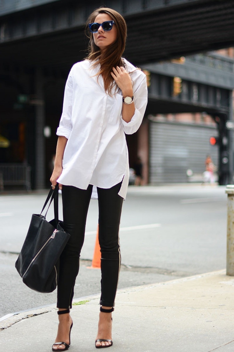 Áo sơ mi dáng dài, đặc biệt là áo sơ mi dáng rộng, khi phối cùng quần legging tạo nên phong cách ấn tượng và thời trang. Bạn có thể sơ vin một phần hoặc thả tự do tùy theo sở thích và phong cách cá nhân.