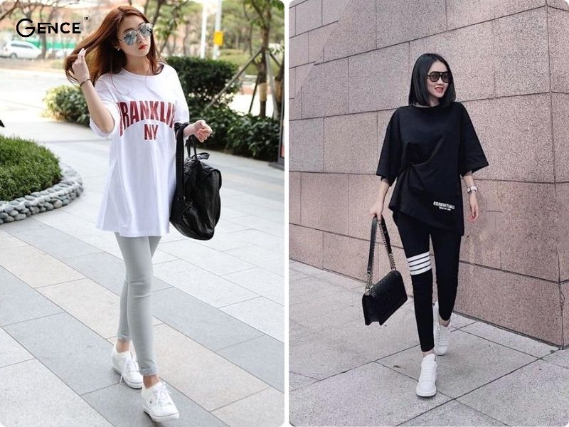 Đây là cách phối đồ đơn giản, thoải mái và trẻ trung, đặc biệt phù hợp với những ngày hè nóng bức. Áo thun form rộng tạo sự thoải mái và che phủ phần hông, đùi – giúp tổng thể outfit cân đối khi kết hợp cùng legging.