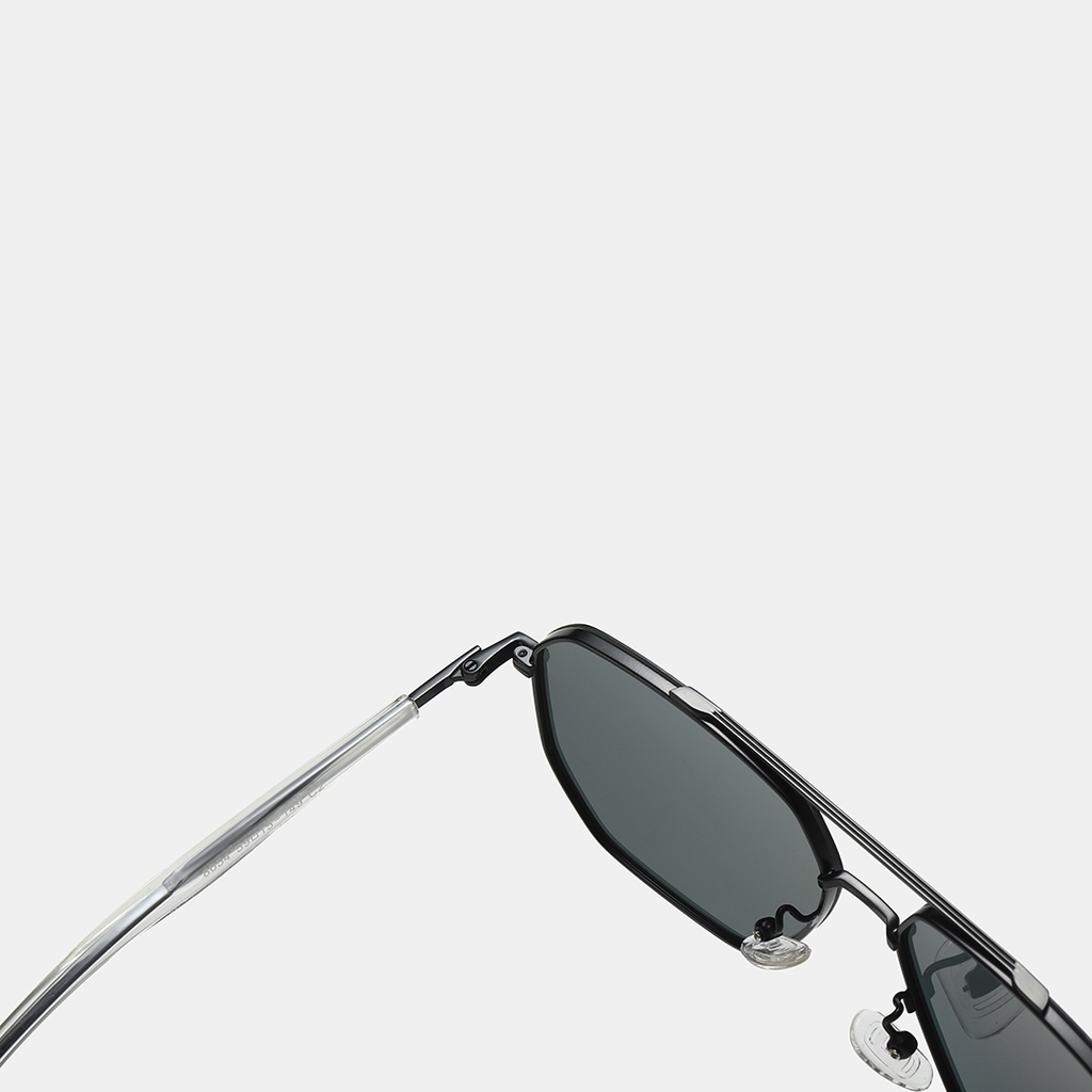 Gọng kính làm từ kim loại cao cấp, mảnh mai nhưng chắc chắn, phủ màu đen sang trọng, kết hợp cùng thanh ngang nối trên phần sống mũi tạo điểm nhấn cá tính
