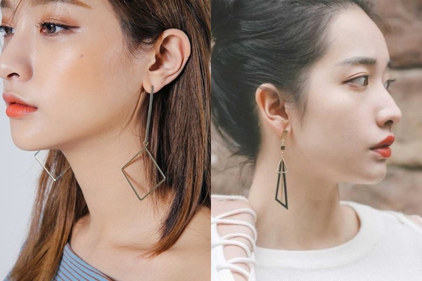 Bông tai hình tam giác ngược: Đây là một lựa chọn táo bạo nhưng hiệu quả, tạo điểm nhấn ấn tượng và làm thon gọn phần cằm.