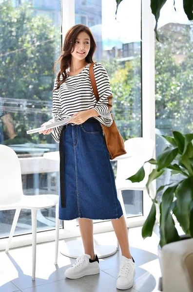 Q: Phối đồ với chân váy dài chữ A có kén dáng không?