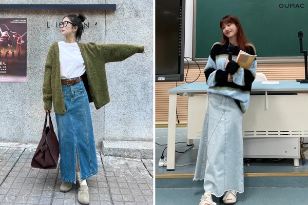 Vào mùa thu đông, chân váy dài chữ A vẫn có thể lên ngôi khi được phối cùng áo len dáng rộng. Công thức này mang đến vẻ ngoài ấm áp, nhẹ nhàng và cực kỳ "so deep" (xu hướng thời trang Hàn Quốc đình đám).