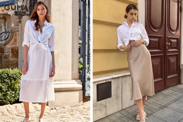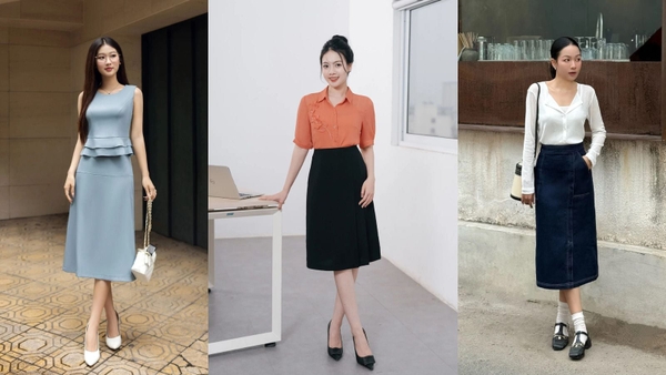 muốn tạo phong cách chỉn chu hơn, hãy phối đồ với chân váy dài chữ A cùng áo sơ mi. Đây là công thức hoàn hảo cho môi trường công sở hoặc những buổi gặp mặt cần sự lịch sự.