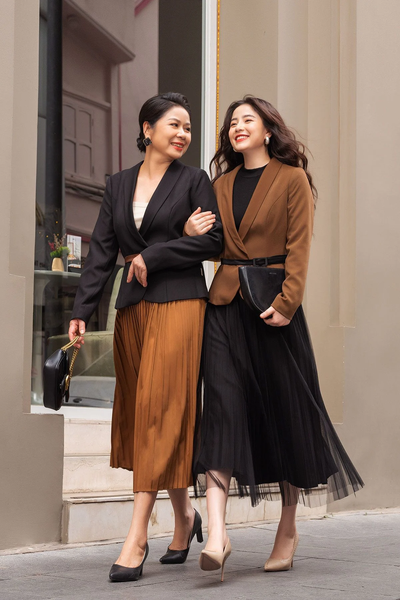 Sự kết hợp giữa chân váy dài chữ A và áo vest blazer mang đến vẻ ngoài vừa thanh lịch vừa mạnh mẽ. Đây là công thức lý tưởng cho những nàng công sở muốn phá cách nhưng vẫn giữ được sự chỉn chu.