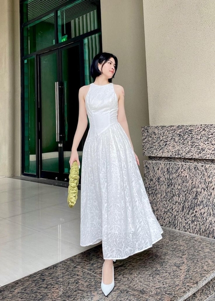 Đầm cổ yếm giúp khoe khéo phần vai và cổ, tạo cảm giác thanh thoát. Đây là lựa chọn phù hợp cho những buổi chiều dạo biển hoặc dùng bữa tối. Khi kết hợp cùng sandal và túi xách nhỏ sẽ tạo nên tổng thể hài hòa.