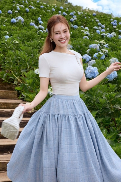 Áo kiểu với các chi tiết như bèo, nơ hoặc cổ V nhẹ nhàng kết hợp cùng chân váy giúp tạo nên tổng thể thanh lịch. Set đồ này phù hợp khi đi dạo, uống cà phê hoặc tham gia các hoạt động nhẹ nhàng tại resort.