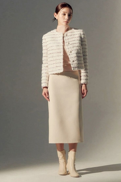 Để tránh cảm giác đứng tuổi, nàng nên chọn áo tweed dáng lửng để tạo hiệu ứng kéo dài tỷ lệ cơ thể. Đây là lựa chọn phù hợp với phong cách hiện đại.