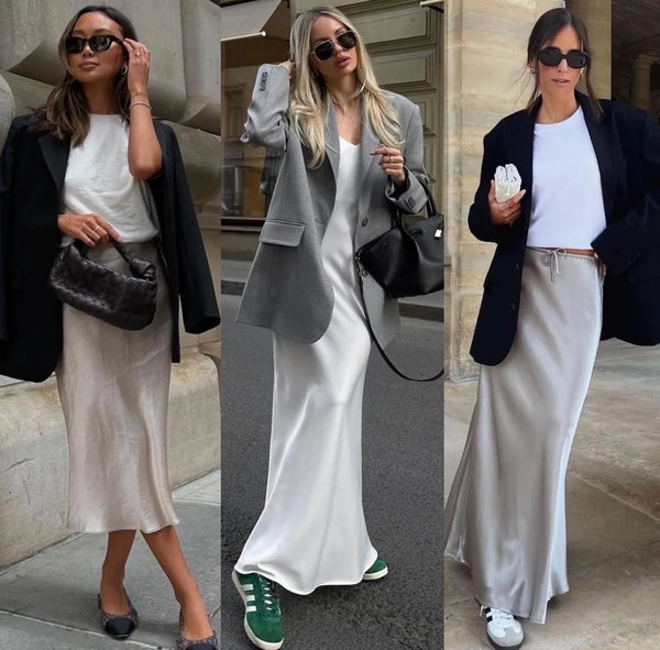 Nếu muốn mới lạ hơn, hãy thử phối đồ với chân váy lụa cùng áo khoác da hoặc blazer form rộng.
