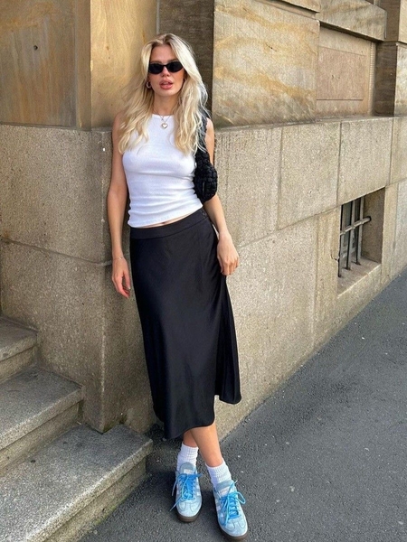 Nếu theo đuổi phong cách tối giản, hãy kết hợp chân váy lụa đen với áo thun ôm sát. Áo thun màu trắng hoặc xám nhạt sẽ làm nổi bật sắc đen huyền bí. Điểm nhấn đến từ chiếc ví da nhỏ gọn và dây chuyền mảnh mai.