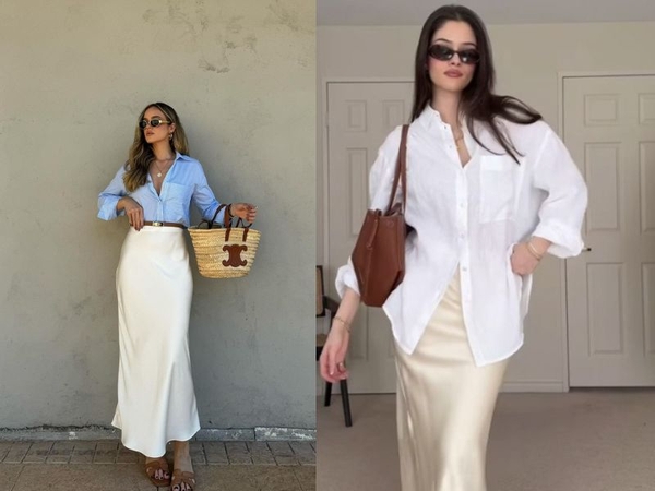 Phối đồ với chân váy lụa dài cùng áo sơ mi basic là công thức kinh điển cho nàng công sở. Bạn chỉ cần chọn áo sơ mi trắng hoặc xanh pastel sơ vin gọn gàng. Set đồ này mang đến vẻ ngoài chỉn chu, thanh lịch mà không hề nhàm chán.