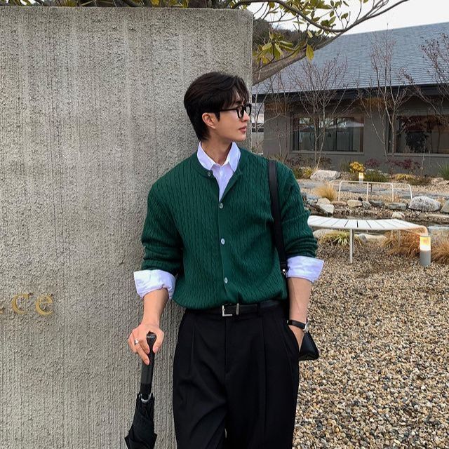 Đây là công thức “kinh điển” của Preppy. Một chiếc sơ mi trắng cài kín cổ, khoác ngoài áo len cổ tim màu navy hoặc xám, kết hợp cùng quần kaki be sáng và giày da lười là đã đủ toát lên vẻ tri thức, nhã nhặn. Nếu muốn thêm chút trẻ trung, bạn có thể xắn nhẹ tay áo hoặc chọn áo len có viền kẻ màu nổi bật.
