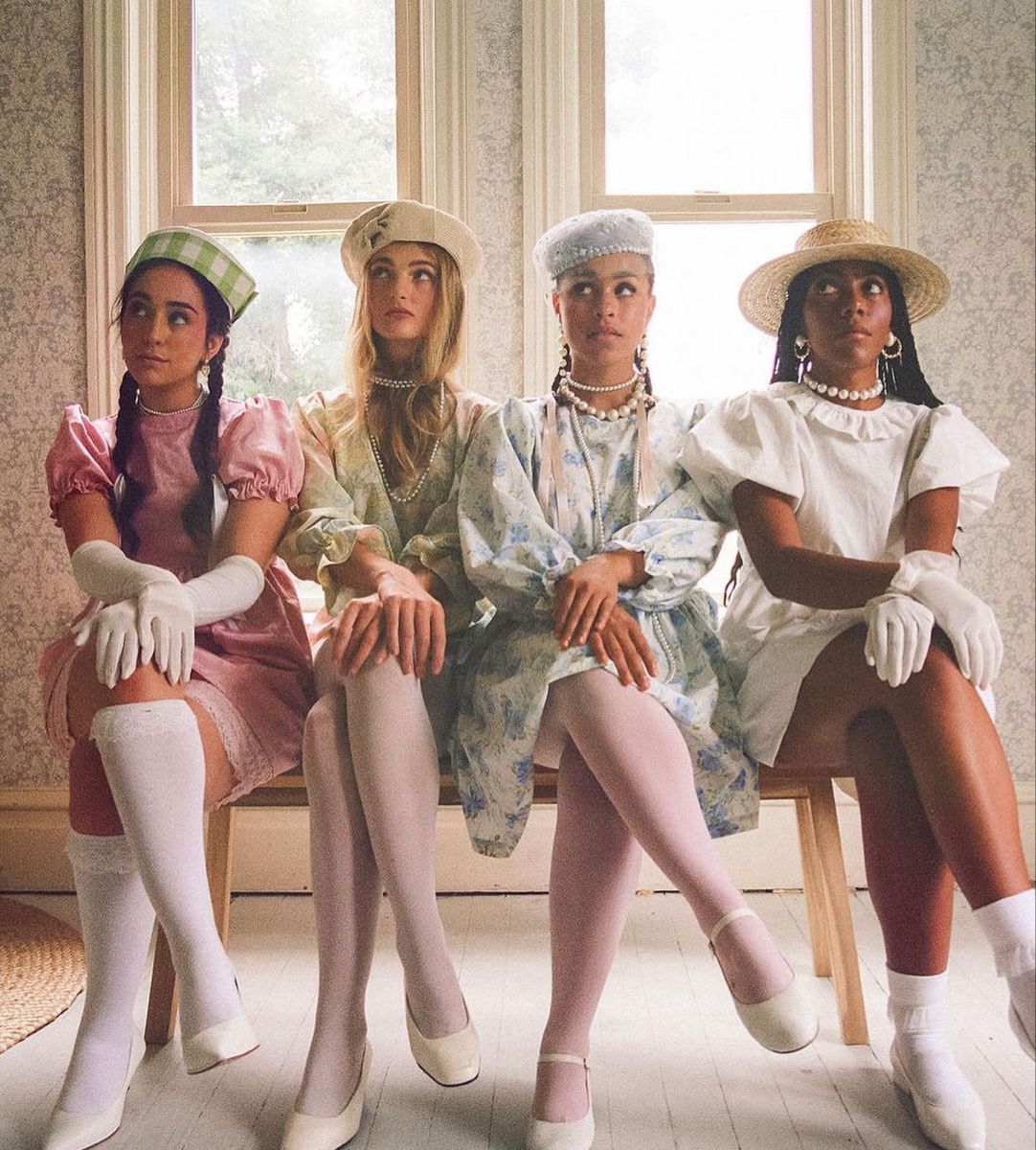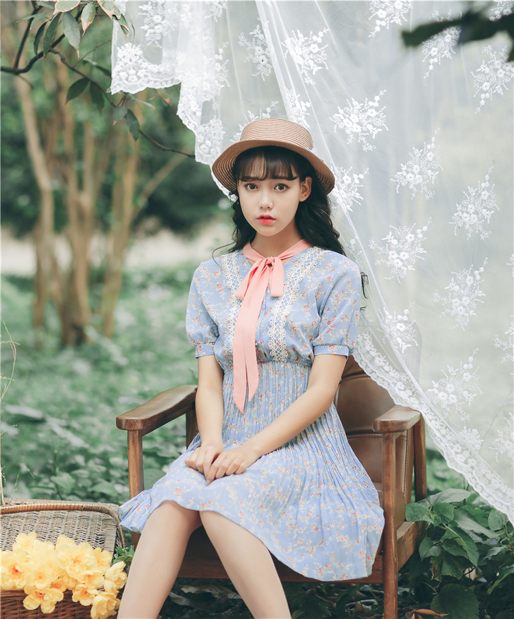 Váy hoa nhí dáng A, tay bồng nhẹ, cổ vuông - một biểu tượng vintage kinh điển. Phối cùng cardigan len mỏng và giày Mary Jane/giày búp bê để tạo nên vẻ ngoài nhẹ nhàng, nữ tính.
