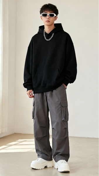 Áo hoodie khi phối cùng quần cargo tạo nên tổng thể đậm chất streetwear. Đây là lựa chọn lý tưởng cho mùa thu đông hoặc những ngày thời tiết mát mẻ. Nên ưu tiên hoodie form rộng để tạo sự cân đối với dáng quần.