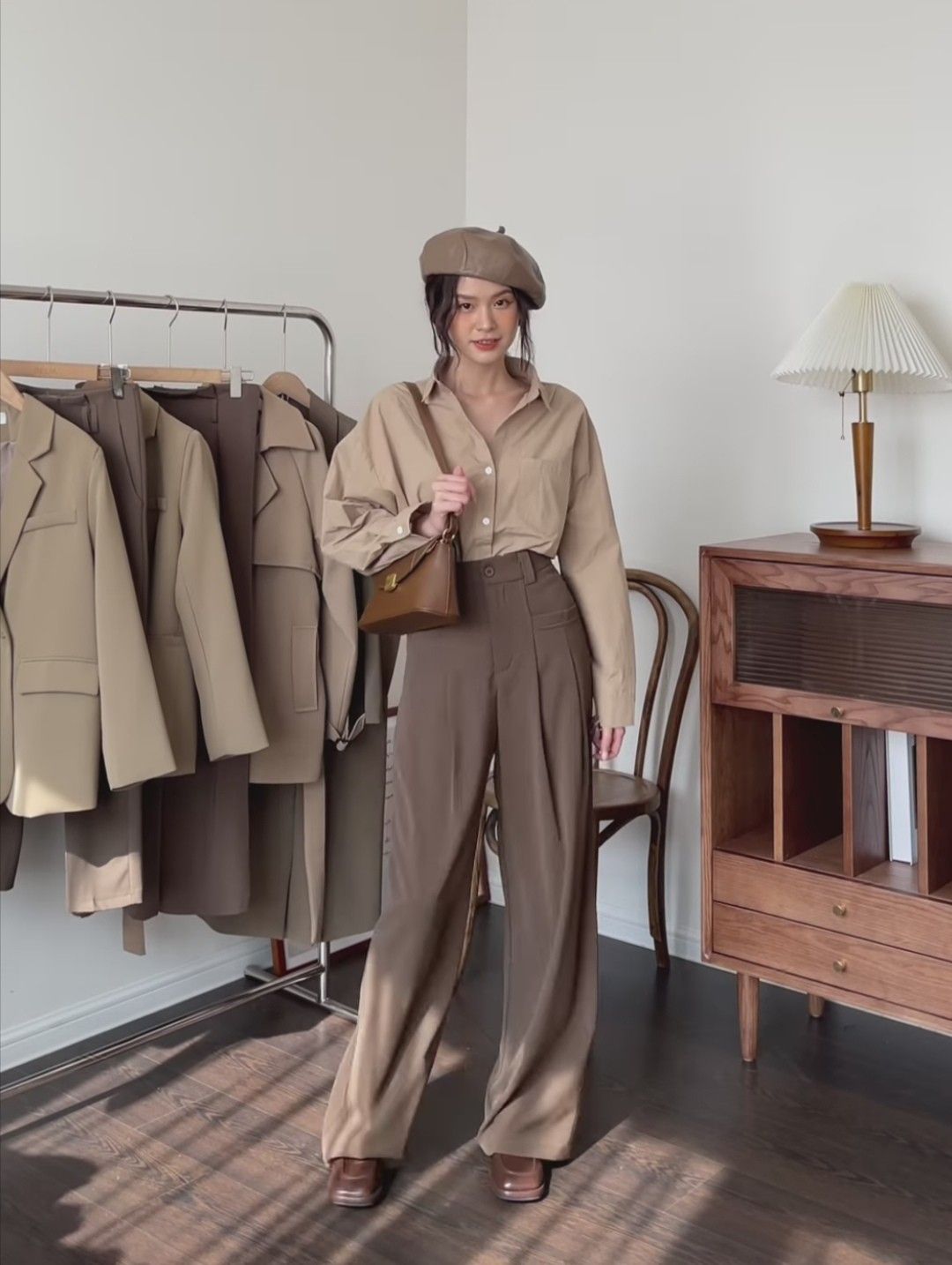 4. Quần nâu + Áo màu đất (be, kem, nâu nhạt): Phong cách "Tone-sur-tone" ấm áp
