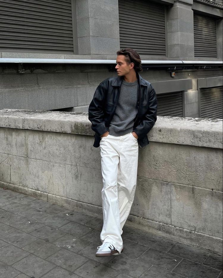 Dành cho những chàng trai yêu thích phong cách mạnh mẽ, phong trần. Áo khoác da đen hoặc nâu sẽ tạo điểm nhấn ấn tượng cho set đồ quần trắng.
