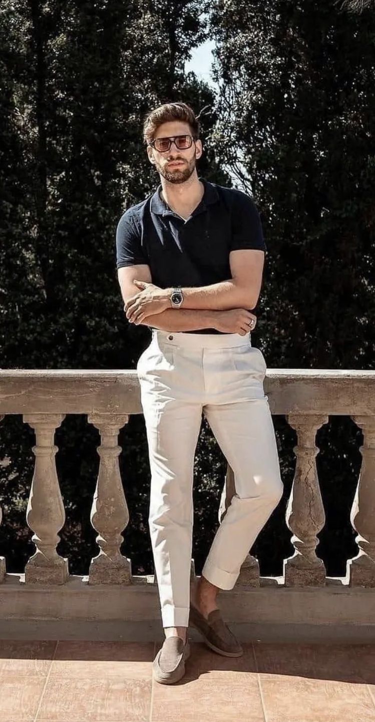 Các màu tối tạo sự tương phản nổi bật với quần trắng, giúp bạn trông lịch lãm và phong độ.